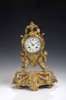 the twin train movement striking on a bell, the enamelled circular dial in drum case supported by pair of cherubs, with urn and vine surmount and festoon pendant, on a corresponding shaped base centred by cupid medallion on turned feet