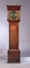 the twin train movement with anchor escapement striking on a bell, the brass dial with Roman chapters and cast spandrels, date aperture, the hood with moulded cornice and turned columns, shaped trunk door, flanked by fluted angles, base with moulded plinth
