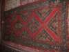 the tomato red field with three and half blue serrated medallions and corresponding panels, within pale border and guard bands