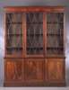 the dentilled cornice above three astragal glazed doors enclosing adjustable shelves, on deeper base with three panel doors and plinth base