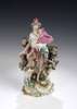 with feathered flower garland to head, pink cloak and elaborately decorated skirt, clutching lamb and sheep at foot, on rococo floral encrusted plinth, gold painted mark