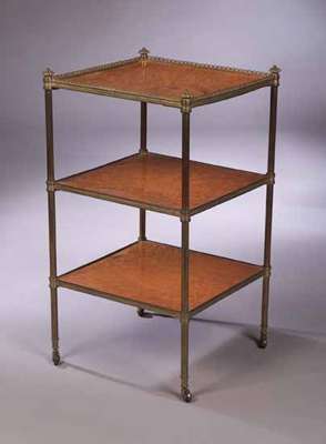 each square tier with pierced brass gallery and supported by brass column and brass castors