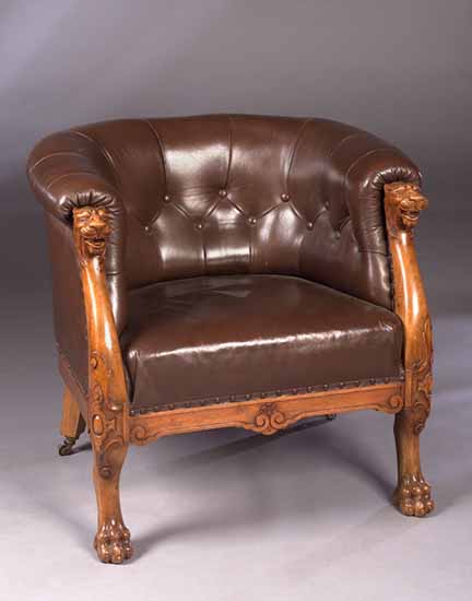 with buttoned leather upholstery, the front uprights carved with lion's head terminals and strapwork decoration, raised on legs with paw feet
