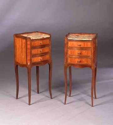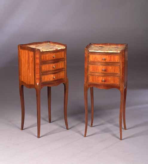 each with bowfront marble top and three quarter gallery above three cherry wood panelled and crossbanded drawers, corresponding chamfered angles and sides, riased on cabriole legs