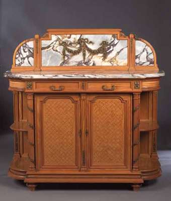 en suite, each with tripartite marble backs above break front veined marble top with quadrant ends, pair of frieze drawers and pair of cupboard doors with arched parquetry panels flanked by turned columns and open shelves, plinth base with turned feet