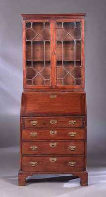 of small proportions, the moulded cornice above astragal glazed doors enclosing adjustable shelves, candle slides, the tall front with fitted interior above four long graduated drawers and lopers, on shaped bracket feet