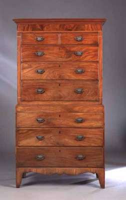 the moulded cornice above two short and three long graduated drawers, flanked by boxwood stringing, the lower section with three long graduated drawers above shaped apron and bracket feet