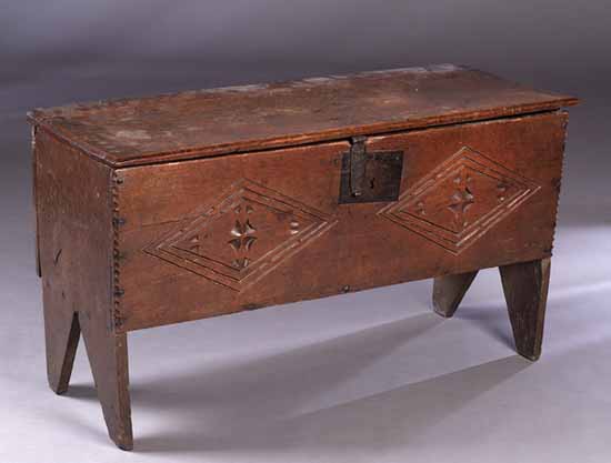 of plank construction, the hinged lid above front with incised lozenge decoration, crimped corners, cut out trestle ends
