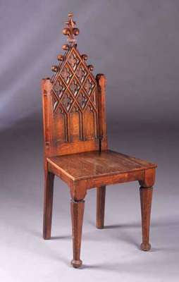 the pointed gothic carved back surmounted by a fleur de lys, flanked by chamfered columns, the solid seat on octagonal tapering legs, with similar feet