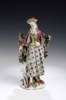 clutching a dead bird, on flowerhead decorated rustic base with a dog by her side, feathered hat and with a powder flask, painted gold anchor
