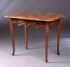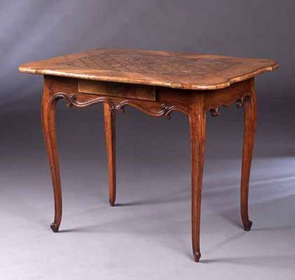 the shaped moulded rectamgular top with central parquetry inlay, above a frieze with S-scrolled mouldings on cabriole legs with scrolled feet