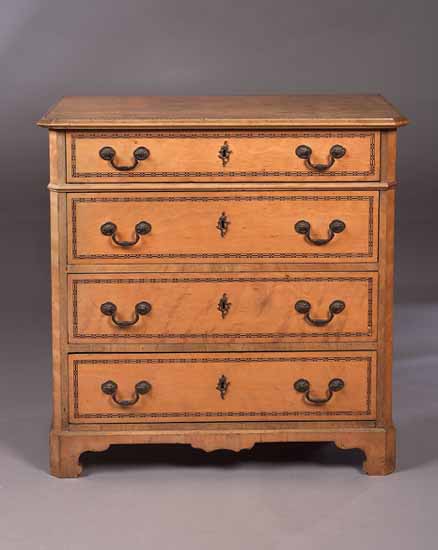 with chequer banding, the rectangular top with canted angles and moulded edge above four long graduated drawers on plinth with shaped bracket feet