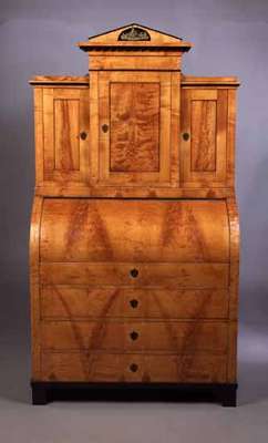 the breakfront upper section with pediment and projecting frieze with ebonised consoles, above three panelled doors, raised on a circular bureau with fitted interior and four long drawers, on block feet