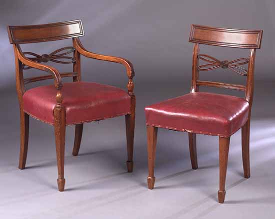 including one carver, the top rail with moulded edge above interwoven back lower rail with turned boss, stuff over seats, square tapering legs, spade feet