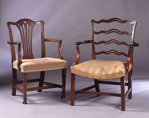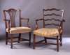 the yoked swag-carved toprail above a tapering pierced splat, the outscrolled arms above upholstered seat on square tapering legs with spreading feet, joined by stretchers