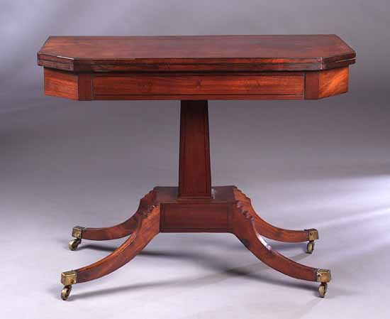 with ebony stringing, the rectangular hinged top with canted corners on square column and stepped splayed quadriform base, brass caps and castors