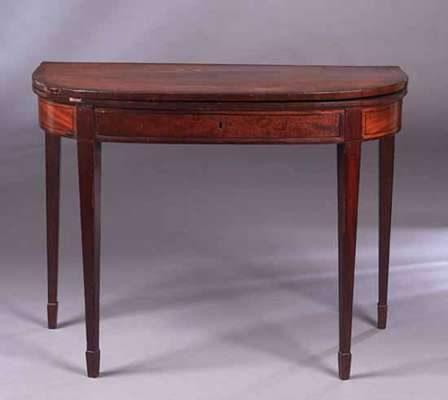 the D-shaped foldover top with crossbanding above frieze drawer and square section tapered legs with spade feet
