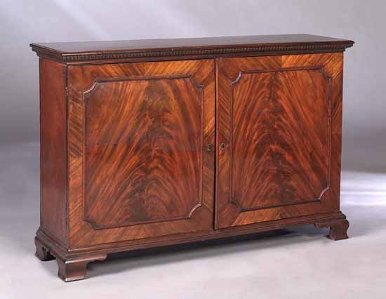 the rectangular top with dentilled cornice above a pair of panelled doors, enclosing interior fitted with pigeonholes on ogee bracket feet