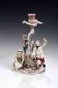 the central candlestick with flower head drip tray and in the form of a trunk, flanked by a girl sitting on a wine flask surrounded by grapes and the judge holding a glass aloft, on flower sprig decorated shaped rococo plinth (see a similar model in the Untermeyer Collection, Metropolitan Museum New York)