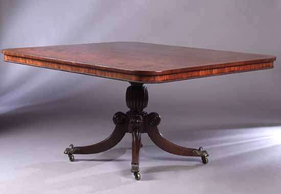 the rectangular top with burr oak border and boxwood and oblong stringing, frieze with beeded edge, raised on turned and reeded bulbous pedestal with four moulded sabre legs with roundel terminals and cast brass caps and castors