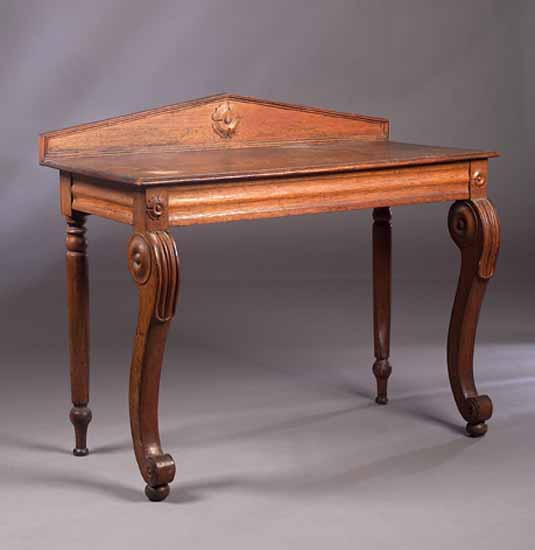 the rectangular top with moulded edge and panelled ledge back centered by rosette, moulded frieze on scrolled truss front legs and turned back legs