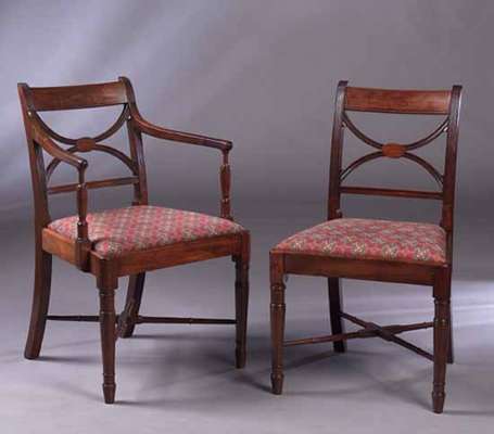 including two carvers, each with bar back above X-splat, drop-in seat on turned front legs joined by stretchers (5)