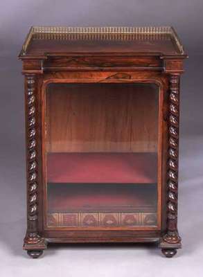 the rectangular top with three quarter balustraded brass gallery above glazed door flanked by barley twist columns enclosing shelves and false fronted drawer, on turned feet