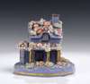 in the form of a cottage with a chimney, decorated with encrusted flowers and foliage, the front porch removable to reveal hollow interior and the base forming a small garden