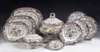 1845-58, printed and painted in the chinoiserie manner with a bird amidst peony blossom, continuous floral and shaped scroll panel border; comprising three graduated ashets, two twin handled vegetable tureens and one cover, a soup tureen cover and stand with dolphin cast handles, two sauce tureen stands and one cover, seventeen meat plates, seventeen fish plates, ten dessert plates, ten soup plates and ten side plates