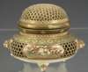 with unusual double honeycomb reticulated lid, the base with opposed grotesque mask handles, cylindrical liner with blue painted Kinkozan mark, reticulated sides flanking flattened cartouche panels of birds and flowers, on three short scroll feet, the base signed in gilt