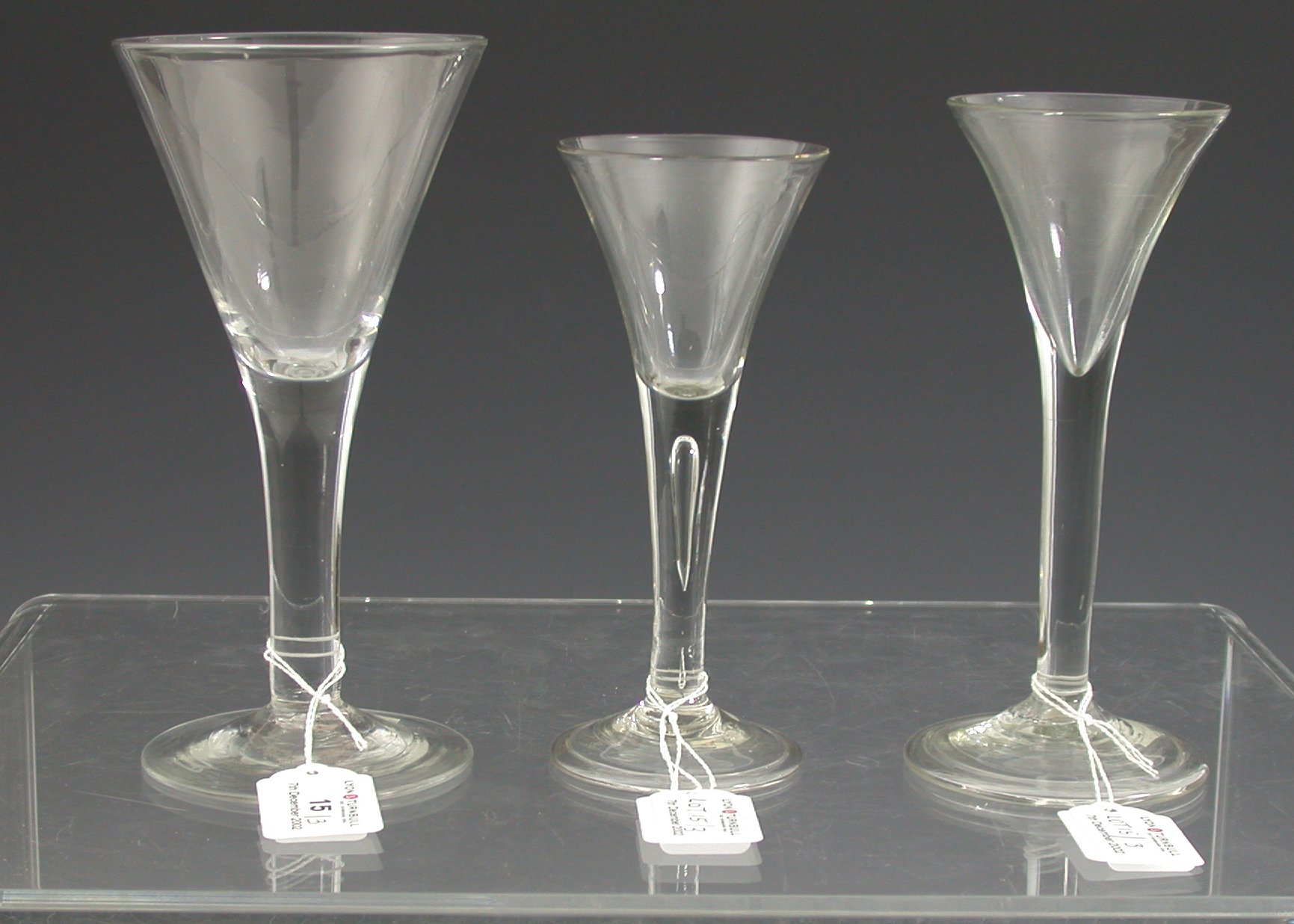 18cm; another two smaller, both with folded foot rim and one with air bubble stem (3)