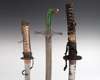 with white ray-skin grip with original cord binding incorporating a pair of Menuki in the form of warrior with a beast, the Tsuba of black lacquer papier-mache decorated with five gilded circles enclosing crossed holly leaves; the single blade curved off centre, with serious corrosion extending over the entire length of the blade which requires re-polishing; siezed tang unable to check for signature, the lacquer scabbard with re-glued split on the leading edge