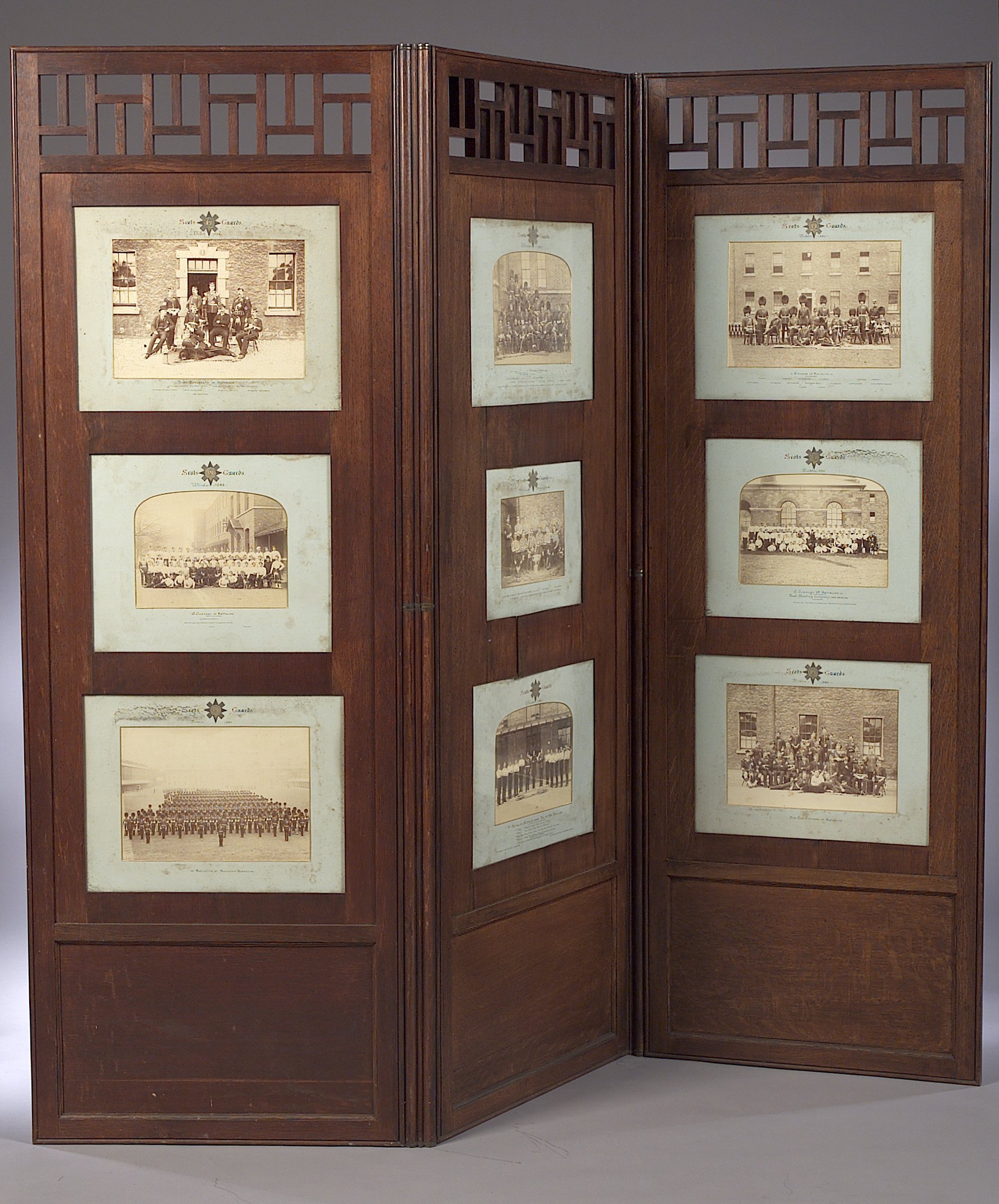 A Victorian three fold hinged oak screen mounted with photos of the Scots Guards