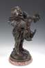 a patinated bronze figure of a young child clutching a cockerel, standing astride a gun carriage, on circular socle with inscription cartouche, on marble base
