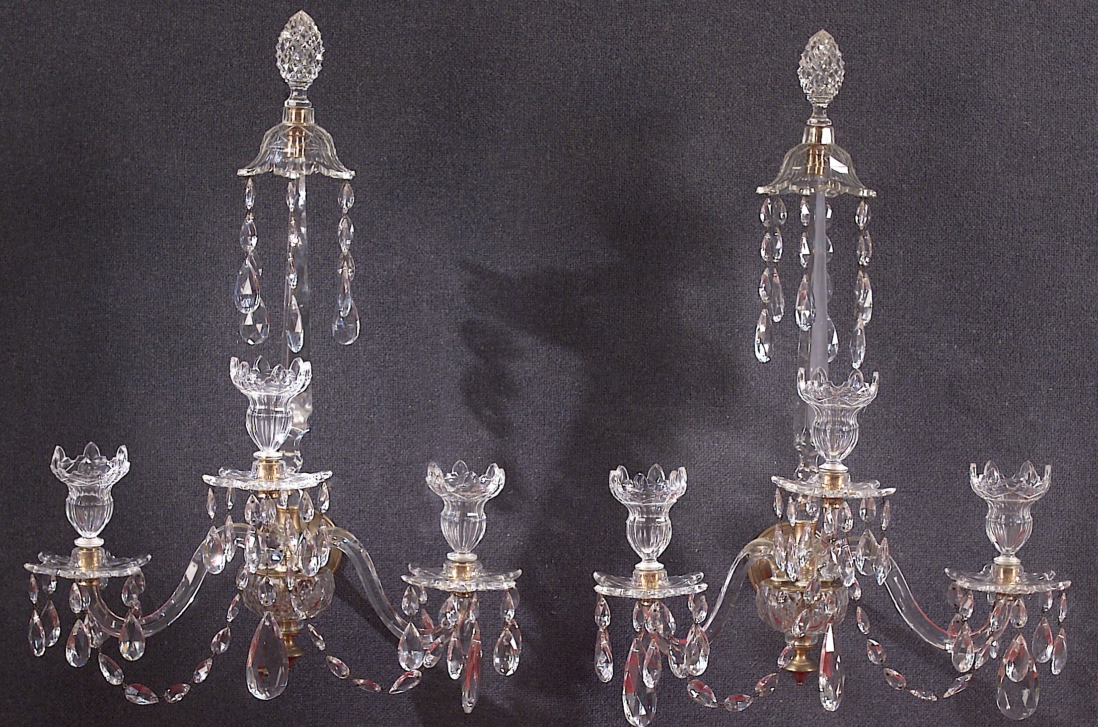 each with triangular section tapering spike above three scrolled branches with urn sconces and star shaped drip trays suspending faceted glass drops with brass wall plate (4)