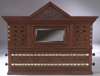 by Orme and Sons, Manchester, the case with central pediment carved with flowers, leaves, and berries above hinged mirror door enclosing shelves marked for balls and flanked by sliding ball scores, pair of revolving number scores below, each running from 1-100, on plinth base