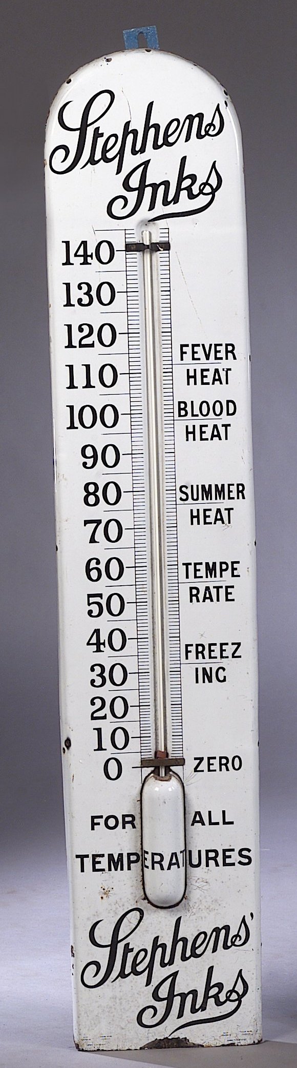 of arched vertical form enamelled white with black inscriptions 'Stephens Inks for all temperatures'