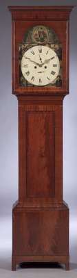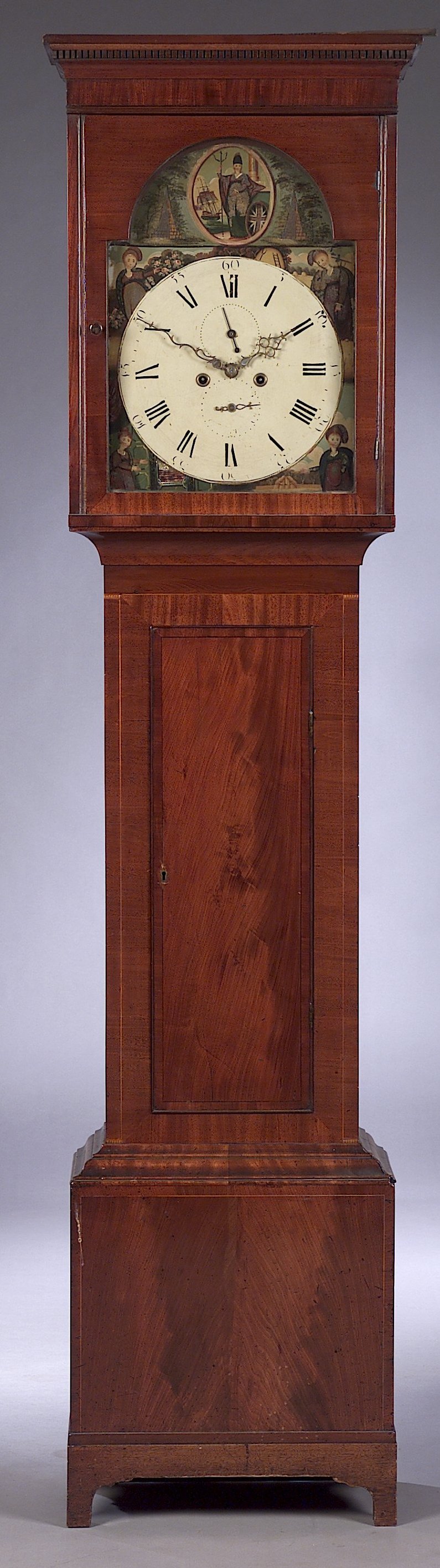 the twin train movement with anchor escapement striking on a bell, the arched dial painted with the seasons to the spandrels and Britannia to the arch, with Roman and Arabic numerals, with subsidiary seconds and date dials, the dentilled corniced hood, above trunk with boxwood stringing, on plinth base with later bracket feet