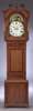 the twin train movement with anchor escapement striking on a bell, with false plate, the arched dial painted with ruins to the spandrels and moon phase dial to the arch, with Roman chapters, subsidiary seconds dial and date aperture, the swan neck pedimented hood with baluster turned columns, above trunk with shaped door between square fluted column angles, on plinth with bracket feet