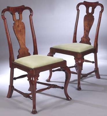 each with pierced splat back and spreading drop-in seat on carved cabriole front legs with pad feet joined by turned and blocked H-stretcher (2)