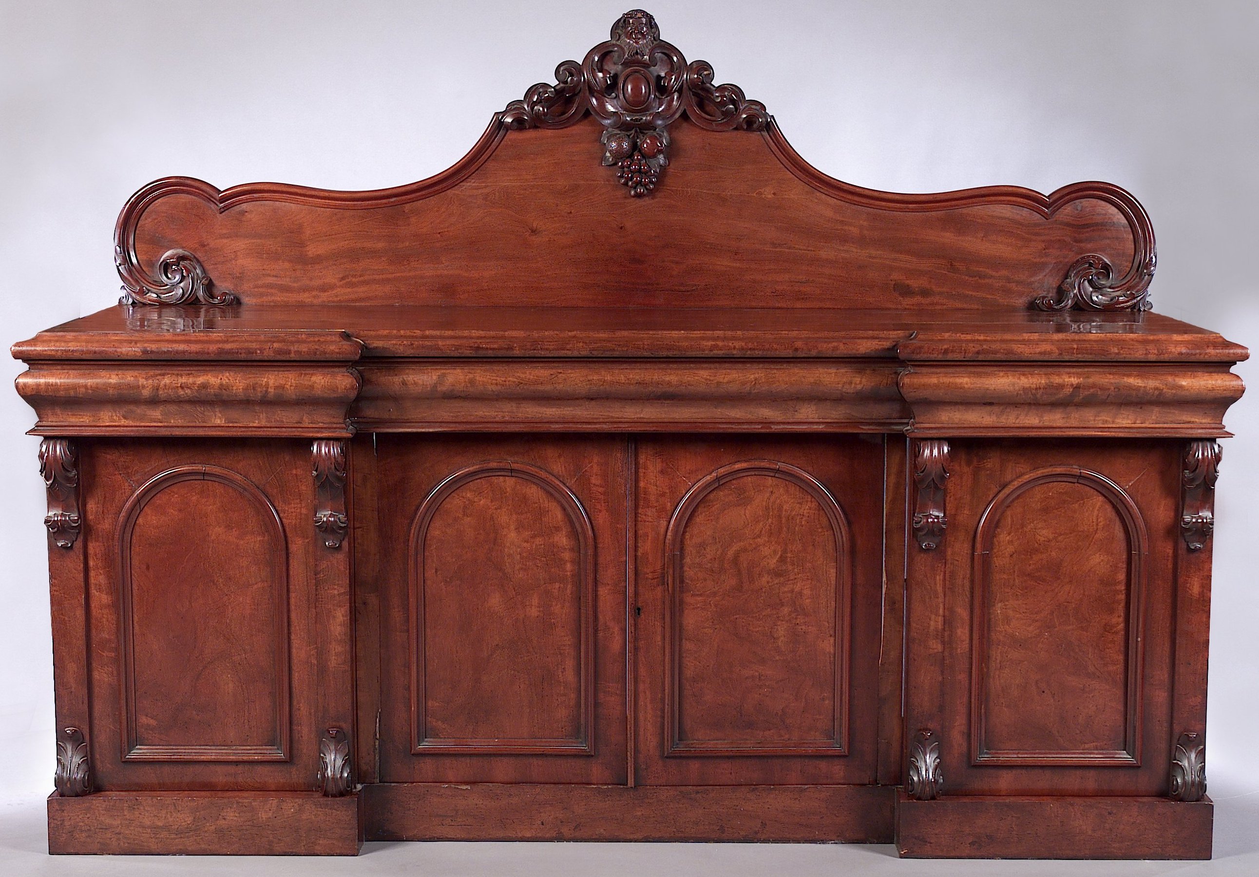 the reverse breakfront top with ogee frieze drawers and scrolling arched back centred by cabochon with mask surmount, raised on solid base with arched panelled doors enclosing sliding trays and shelves, on plinth