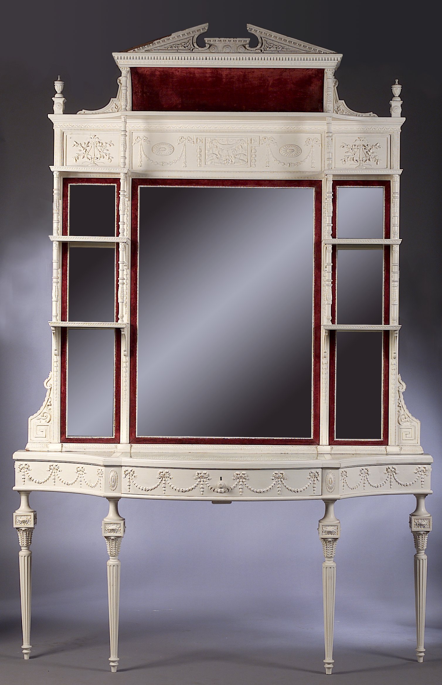 painted in white with claret velvet linings, profusely decorated with ribbon tied husk swags, rosettes and leaf clasps, the upper section centred by rectangular plate flanked and surmounted by open shelves with turned supports, griffin and lyre panels above and broken pediment, the table with bowfront and concave sides, mirror top above single drawer, raised on four fluted turned and blocked legs