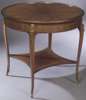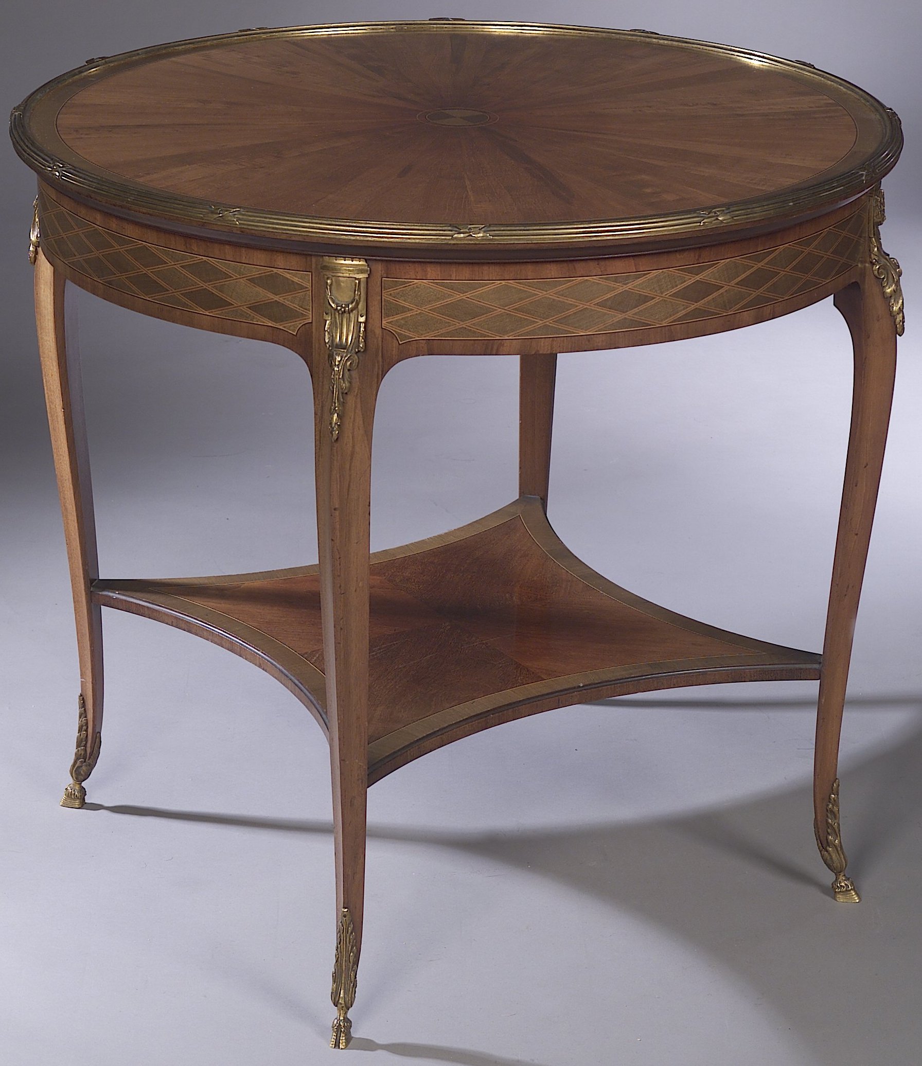 with gilt brass mounts, the circular top with radiating veneering and ribbon tied reeded raised brass rim, above parquetry frieze and moulded slender cabriole legs wtih brass hoof feet, joined by concave undershelf, stamped Bi 2888 109