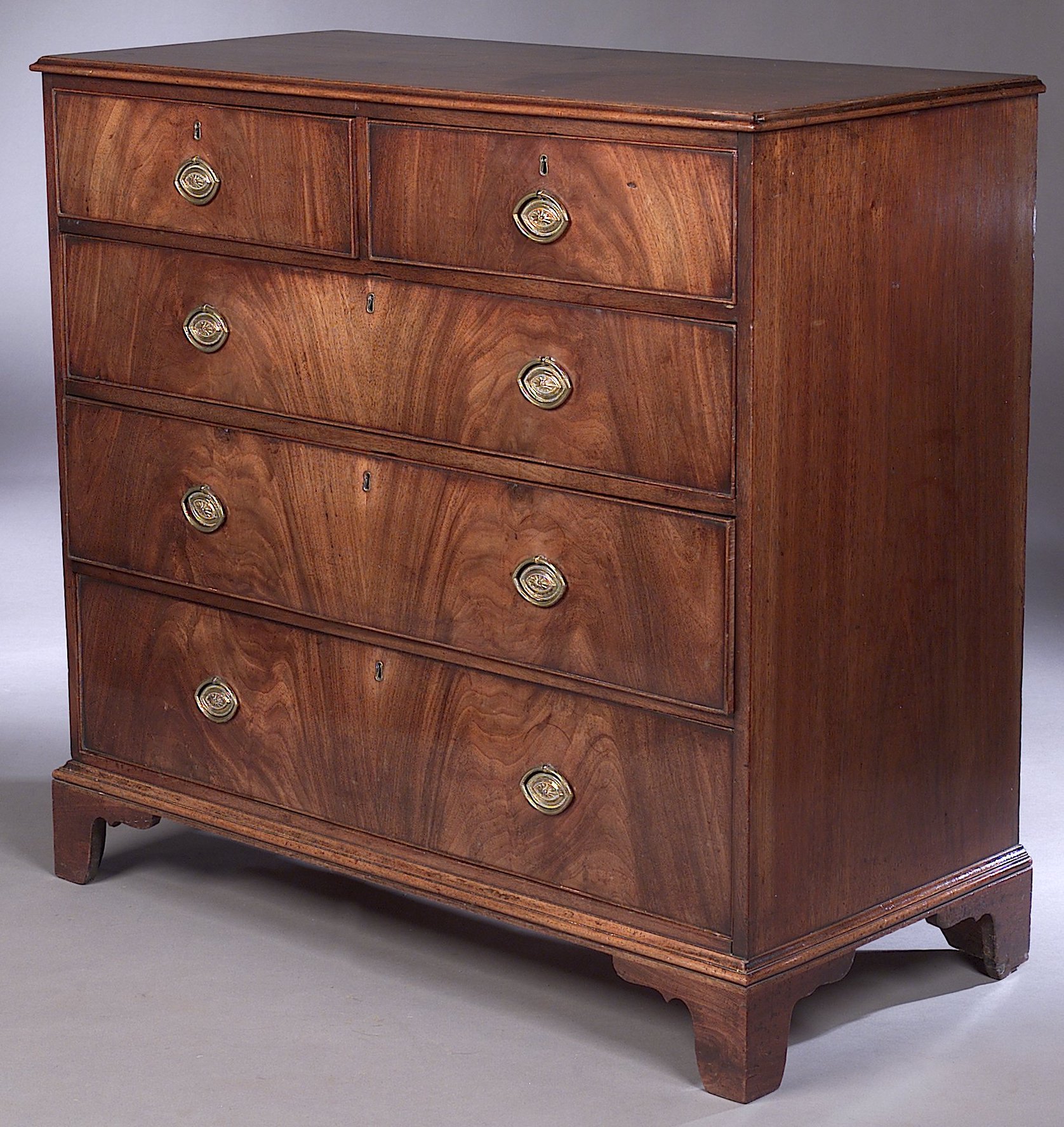 the rectangular top with moulded edge above two short and three long graduated drawers on shaped bracket feet