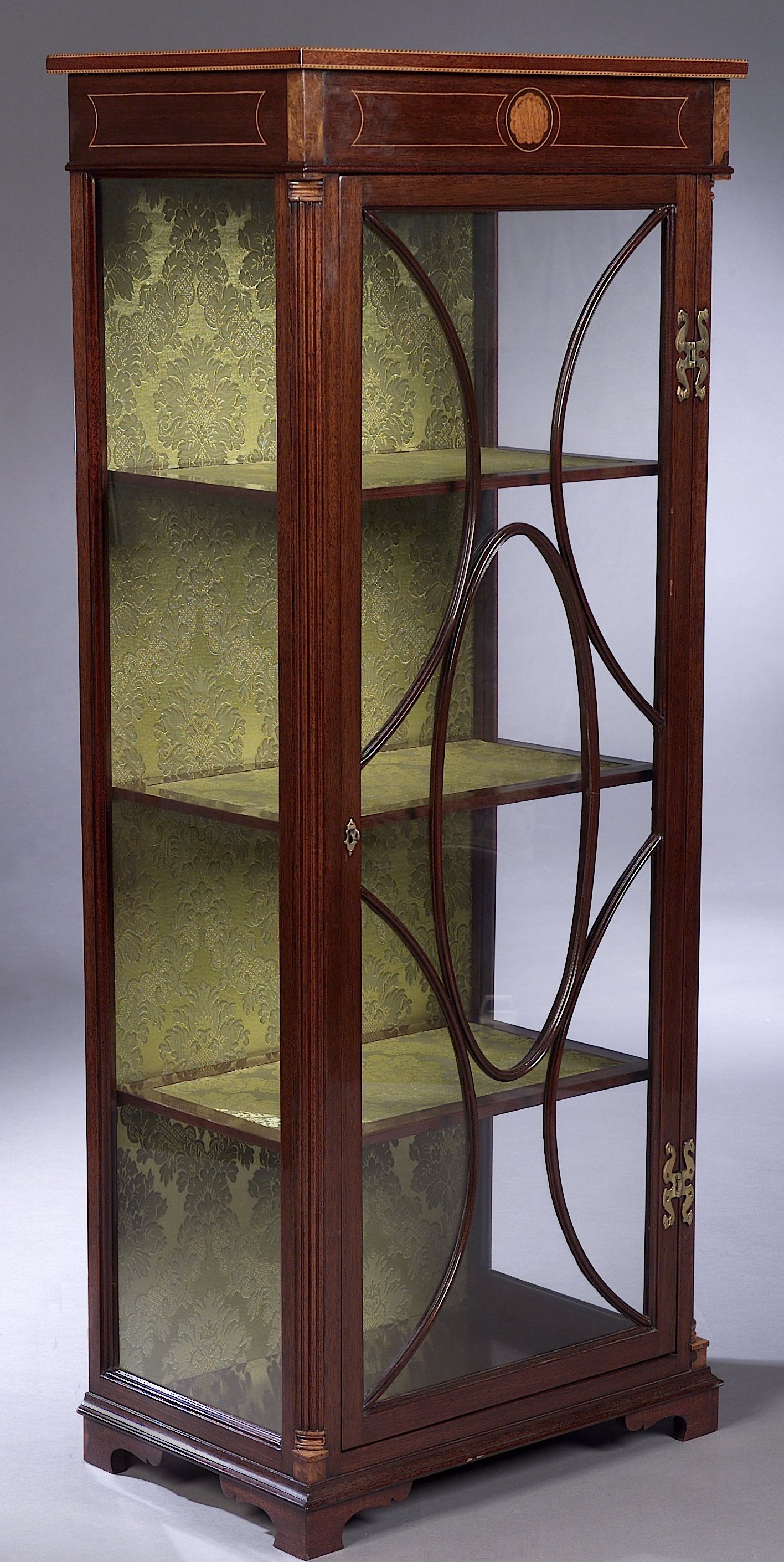 with boxwood and chequer stringing, the rectangular top above inlaid frieze and astragal glazed door enclosing lined shelved interior, flanked by reeded quarter columns, plinth with shaped feet