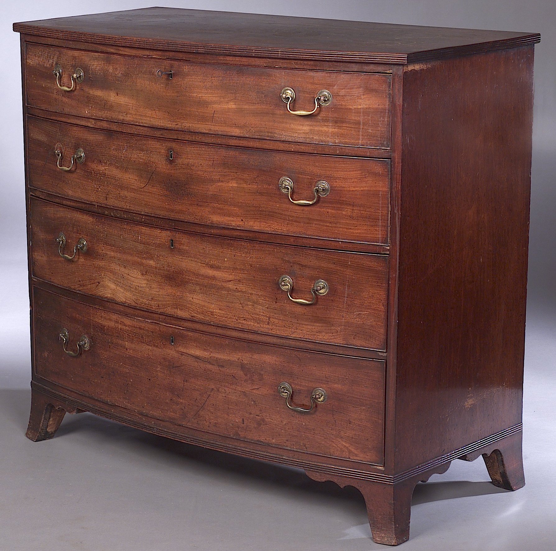 the shaped top with reeded edge above four long graduated drawers on splayed bracket feet