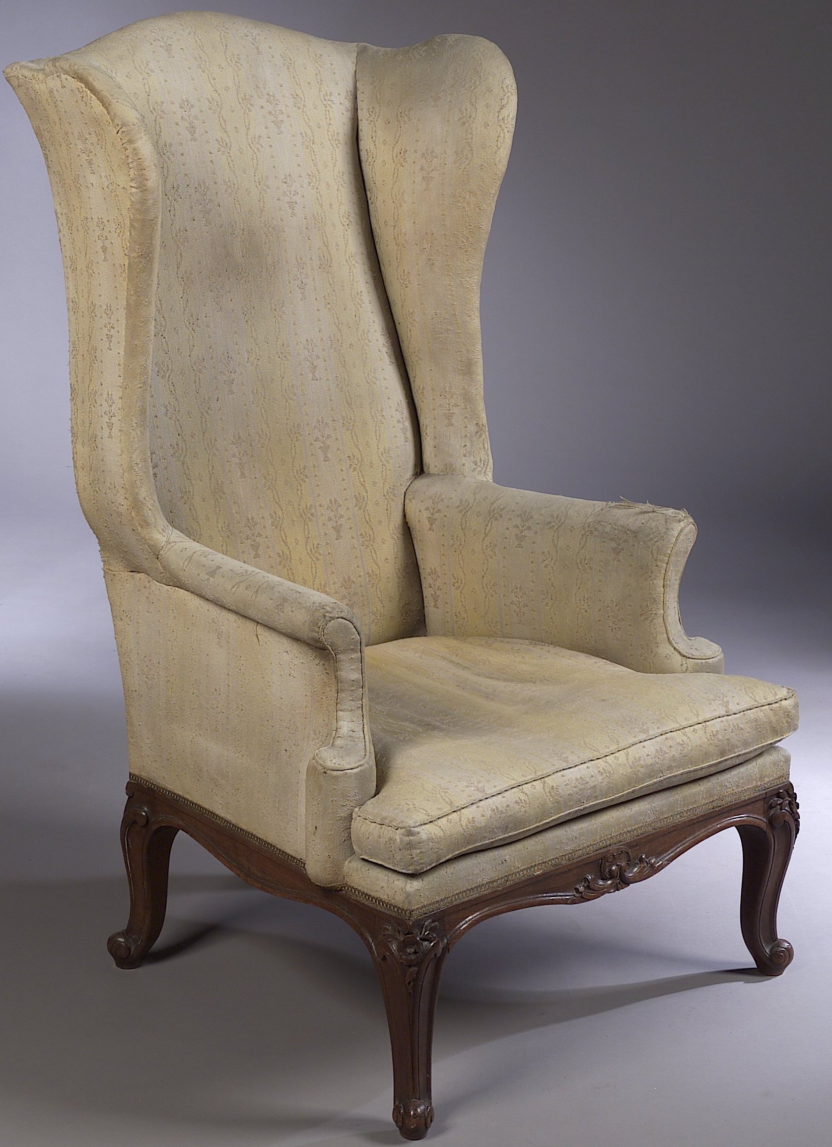 the tall upholstered back with outscrolled legs and arms, separate squab, raised on moulded seat rail and floral carved cabriole legs with scroll toes