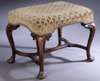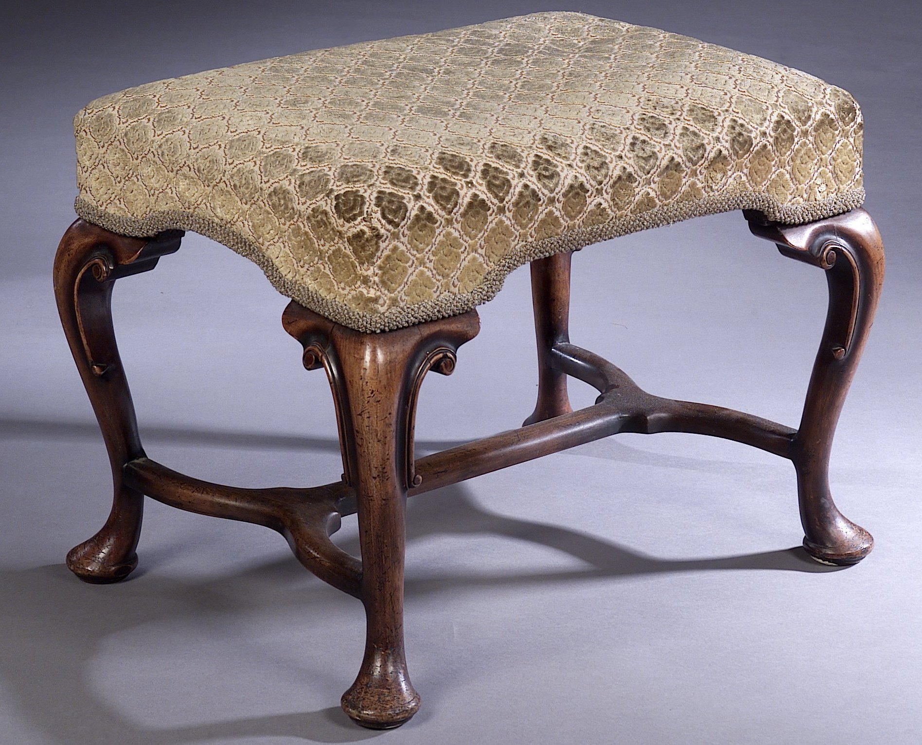 the rectangular stuffover seat raised on carved cabriole legs with pad feet joined by shaped H-stretcher