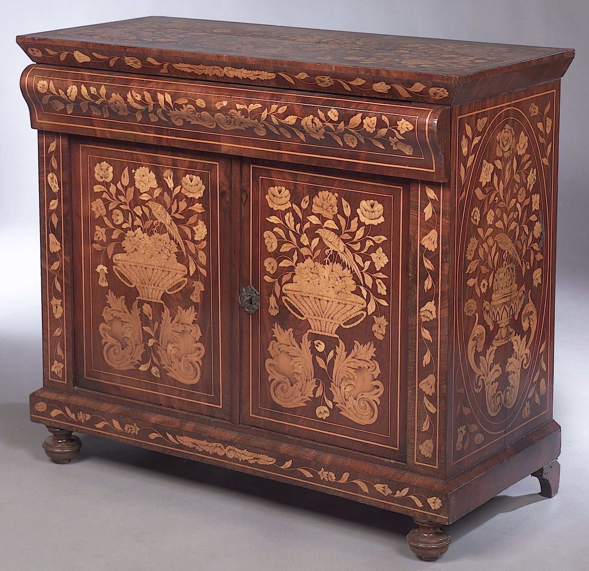 the marquetry with baskets, flowers and birds, the rectangular top above ogee frieze drawer and pair of doors flanked by pilasters on plinth and turned feet