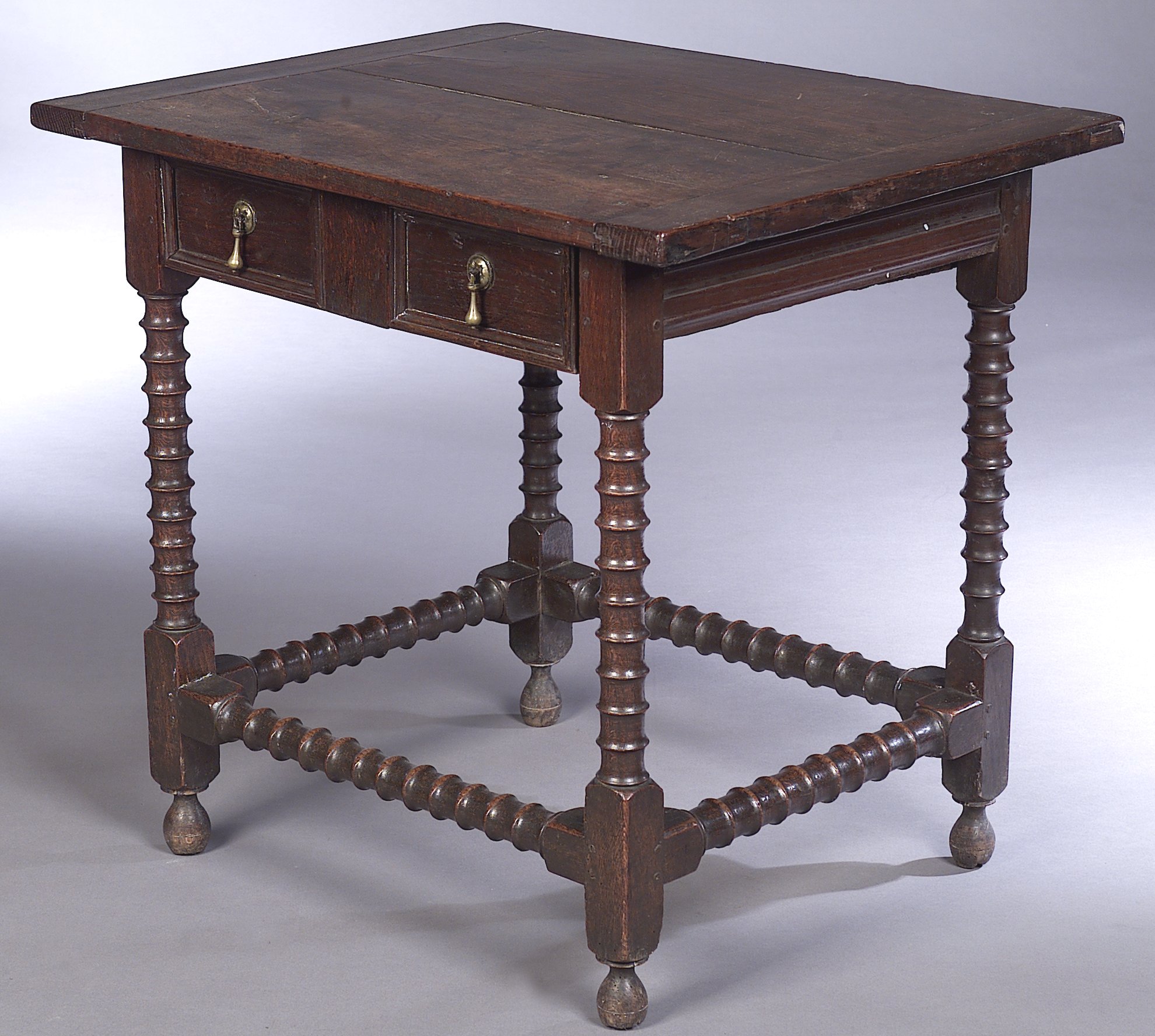 the rectangular top above panelled drawer and bobbin turned and blocked legs joined by similar stretchers